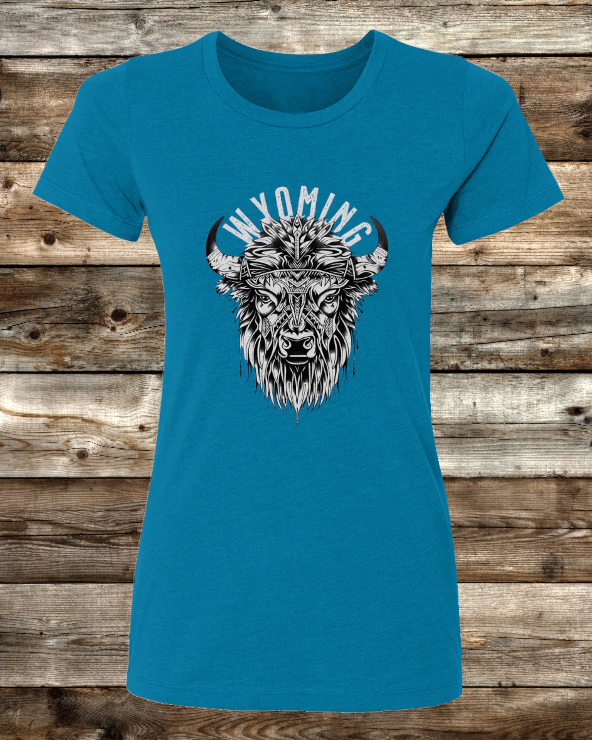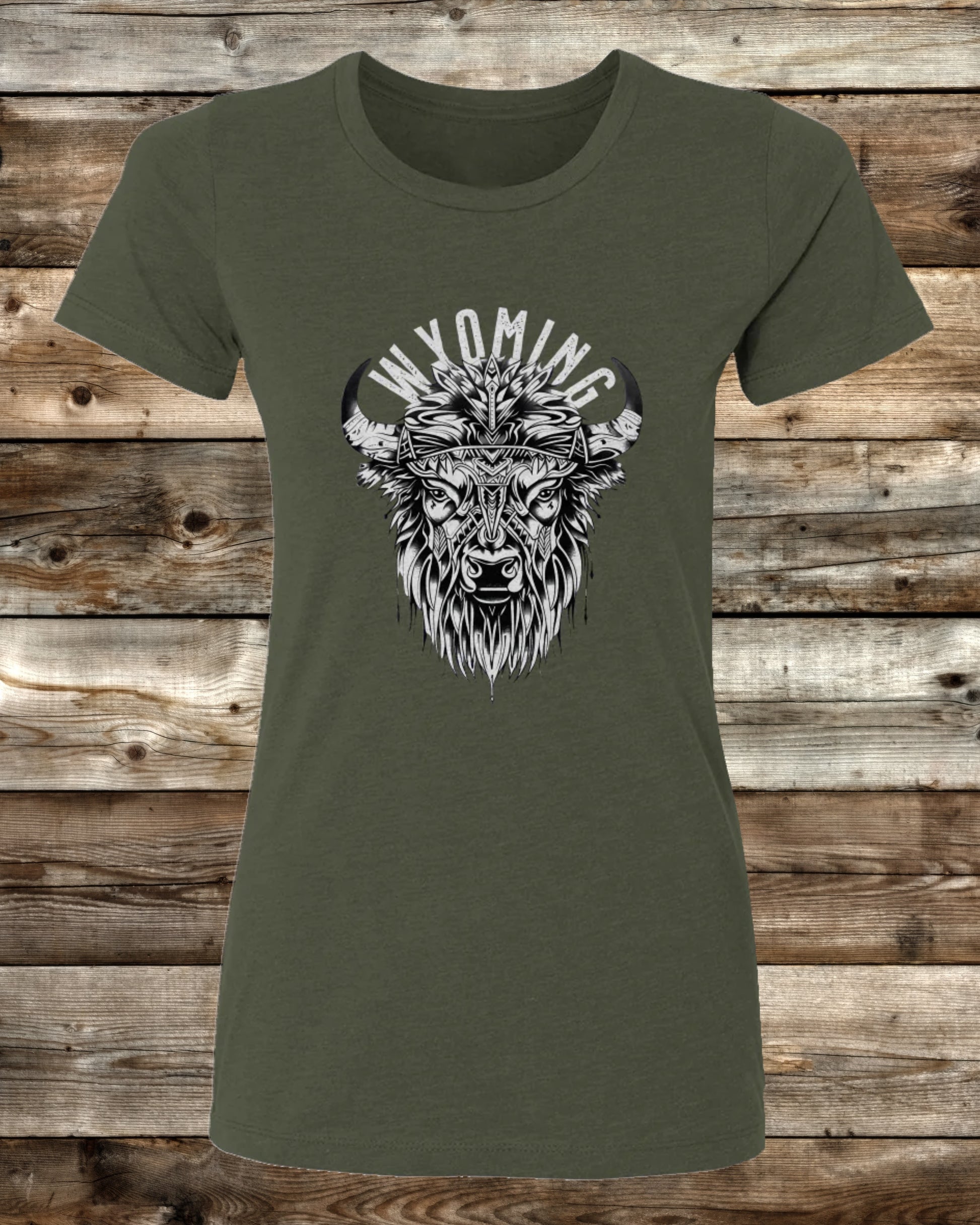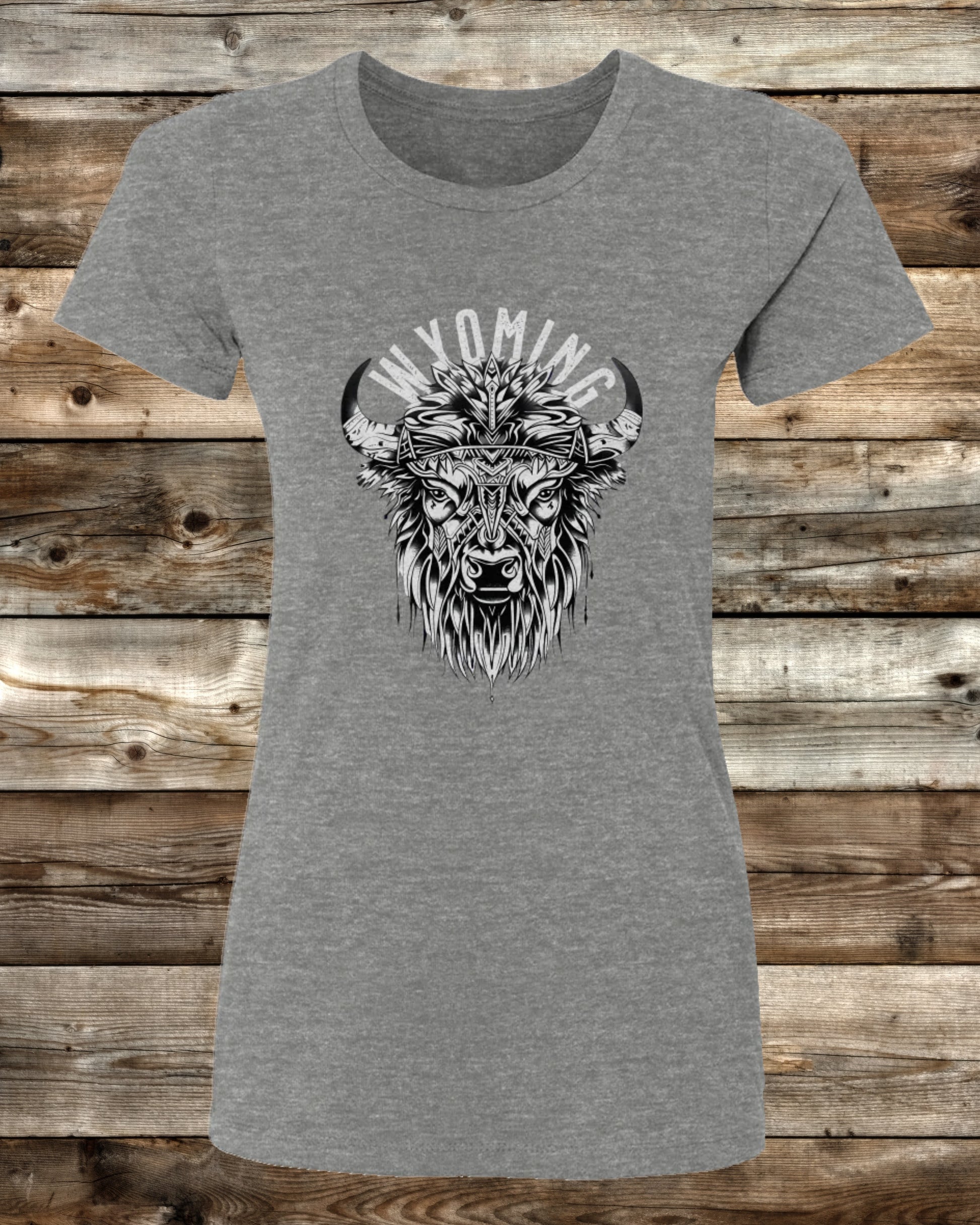 Stand strong. Live bold. Wear your Wyoming pride with the WYOMING TRIBAL BISON Ladies Cut T-Shirt.